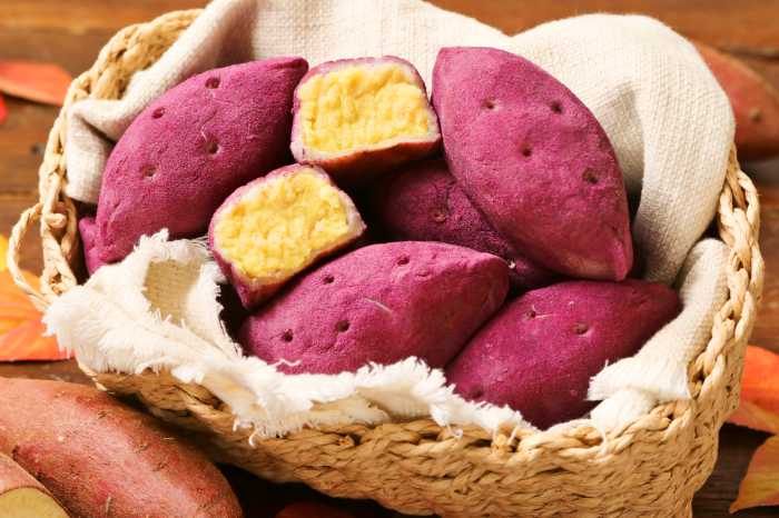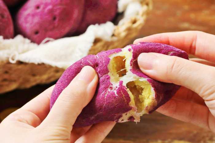 まるでさつまいもそのもののビジュアルに思わず写真を撮りたくなる「コグマパン」。鮮やかな紫色の生地は紫いもパウダーで色付けし、中にはなると金時のコク深いペーストがたっぷり。