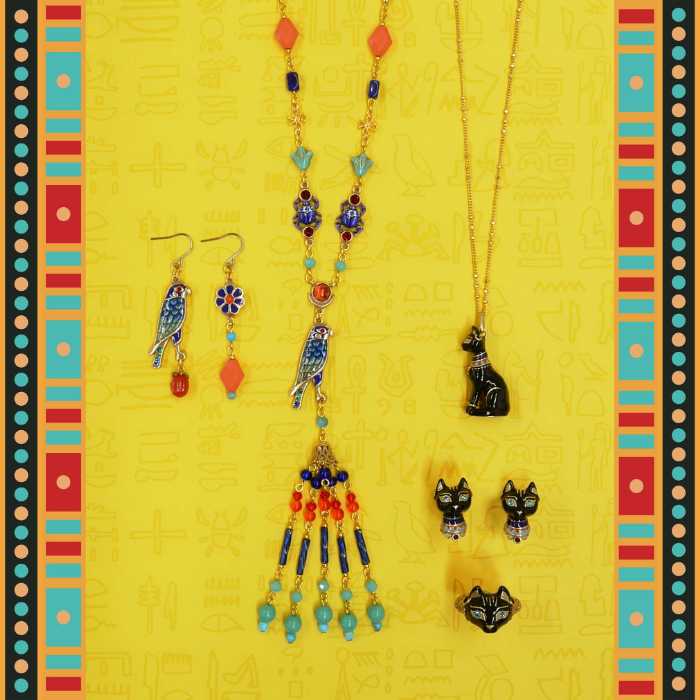 古代エジプトの王族や貴族が身に着けた装飾品の色彩を再現し、深みのあるブルーや鮮やかなゴールドが存在感を放ちます。