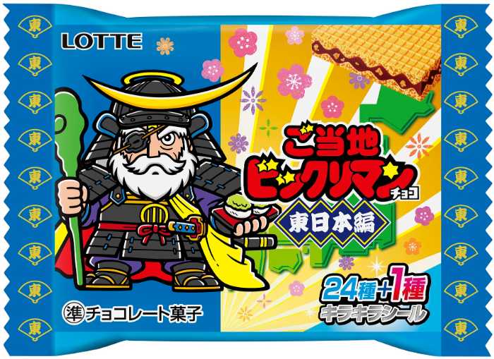 今回の「ご当地ビックリマンチョコ」は、東日本編と西日本編の2種類展開。各エリア25種、合計50種のシールがランダムで1枚入っています。