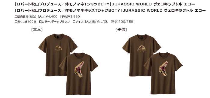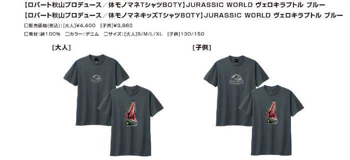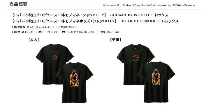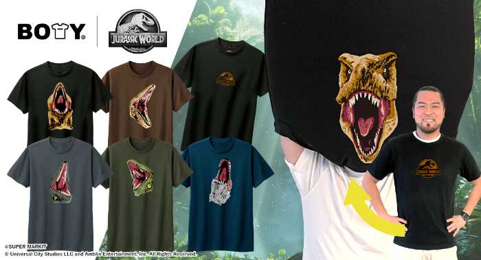株式会社スペースエイジは、ロバート秋山氏プロデュースの体モノマネTシャツ「BOTY」シリーズより、ジュラシック・ワールド最新作『復活の大地』公開に合わせ、人気恐竜デザインTシャツ全5種の受注を8月6日(水)より開始しました。裾をめくると恐竜の顔が現れる遊び心あるデザインで、キッズサイズもあり、親子で映画の興奮をそのまま楽しめます♡