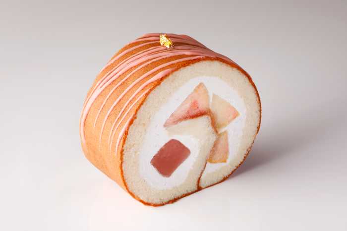 東京・大阪限定『新ピーチロール』(¥1,512)は、ホテルオリジナル雑穀「Jシリアル」入りの玄米卵スポンジで「一桃匠」と桃のくずもちゼリーを包み込んだ贅沢ロール。