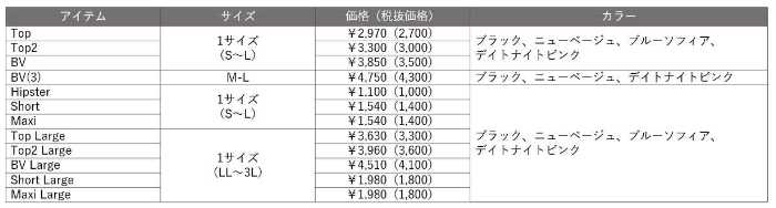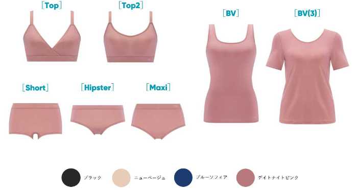 ラインナップは、ブラ2型・ブラトップ2型・ショーツ3型の計7型を、各4色展開でご用意。着用シーンやファッションに合わせて選べる豊富さが魅力です。