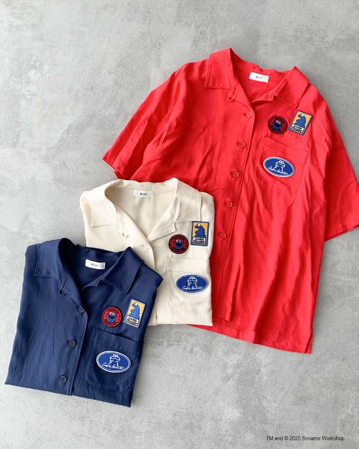ワッペン付ボウリングシャツ(4,950円):キナリ/レッド/ネイビーの3色。胸元のクッキーモンスターのワッペンが愛らしい。