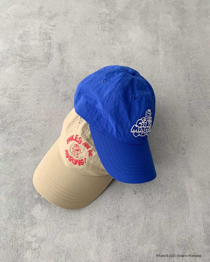 刺繍キャップ(4,950円):ベージュ(エルモ)/ブルー(クッキーモンスター)。カジュアルスタイルの差し色に。