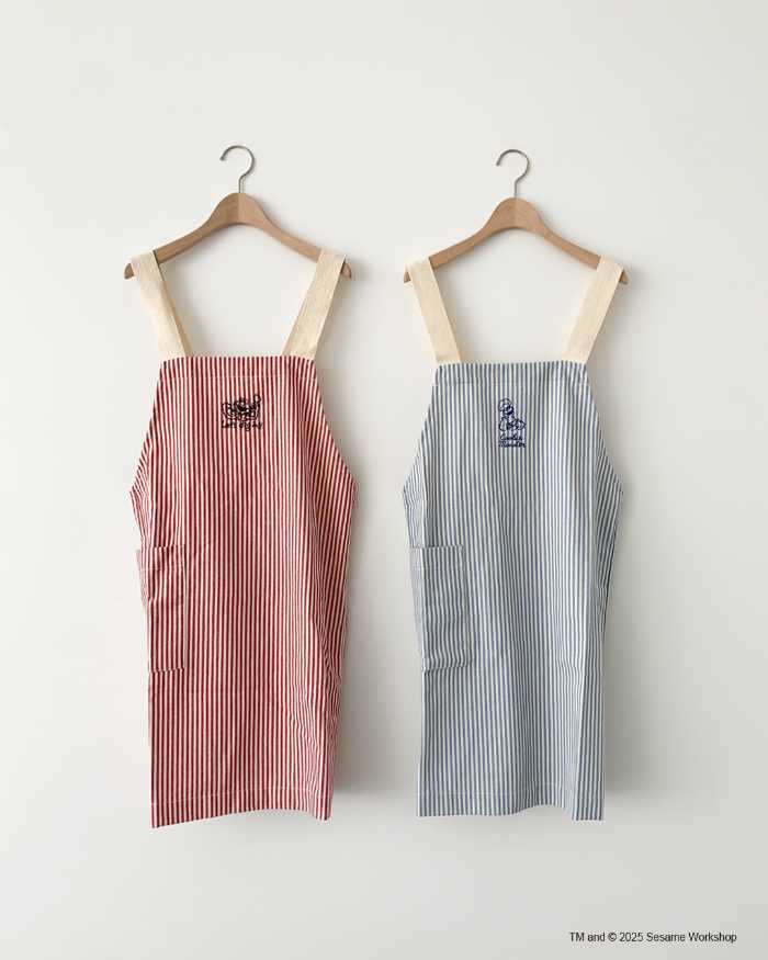 刺繍エプロン(6,600円):レッド/ブルーのストライプ柄。大きめポケット付きで実用性◎