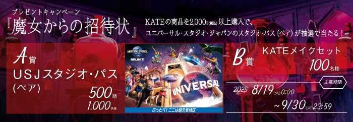 KATE商品を税込2,000円以上購入すると応募が可能で、抽選で「USJスタジオ・パス(ペア)」が500組に、または「KATEメイクセット」が100名に当たります。応募期間は9月30日(火)まで。