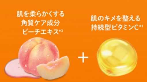 角質ケア成分としてモモ果実エキス5を配合。肌表面をやわらかく整え、ビタミンC1の浸透力4をサポートします。