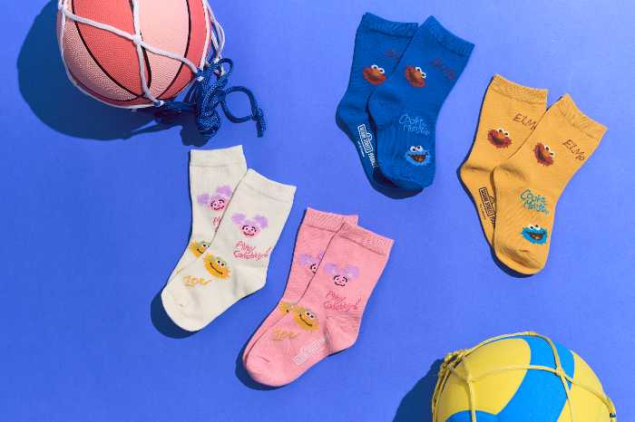 ソックス(全4種/オフホワイト・ブルー・イエロー・ピンク/1,485円)…エルモやクッキーモンスターなど人気キャラが左右で楽しい表情を演出。柔らかな素材で履き心地も抜群。