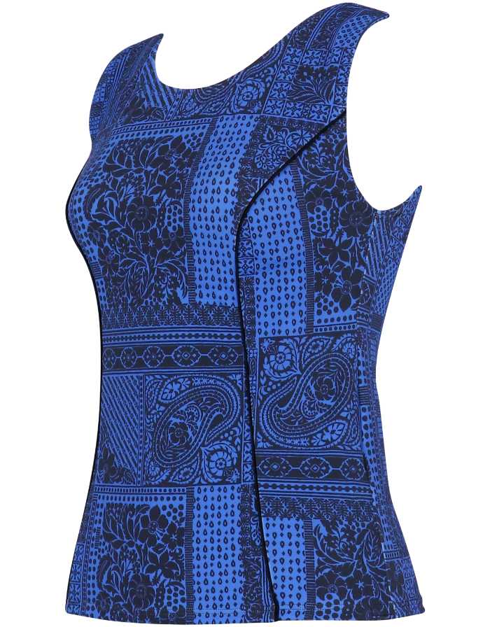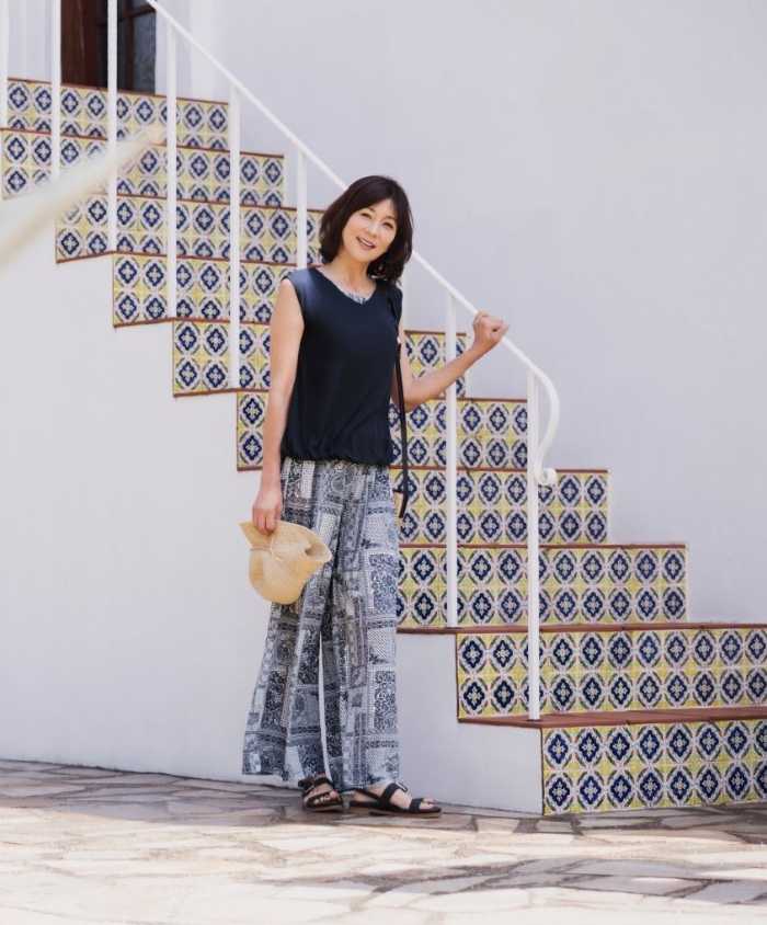 バンダナ柄をあしらったデザインはリゾート気分を高めてくれます。三浦りさ子さんの声を反映し、大人女性が安心して着られるシルエットと、旅先でも街でも映えるスタイルが実現しました。
