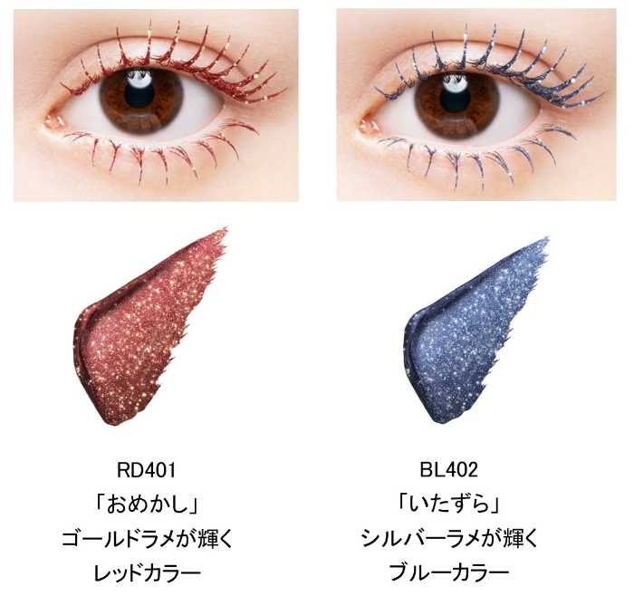 価格は各1,980円(税込)、全2色展開です。RD401キャンディレッド「おめかし」はゴールドラメが輝くレッド、BL402キャンディブルー「いたずら」はシルバーラメが冴えるブルー。