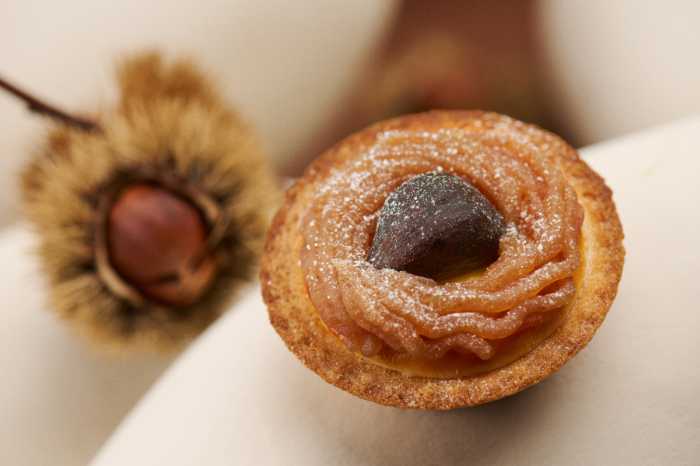 最後にやってくるのは「焼きたてタルト モンブランチーズ」。栗ペーストをふんだんに使い、渋皮栗の甘露煮を贅沢にトッピング。