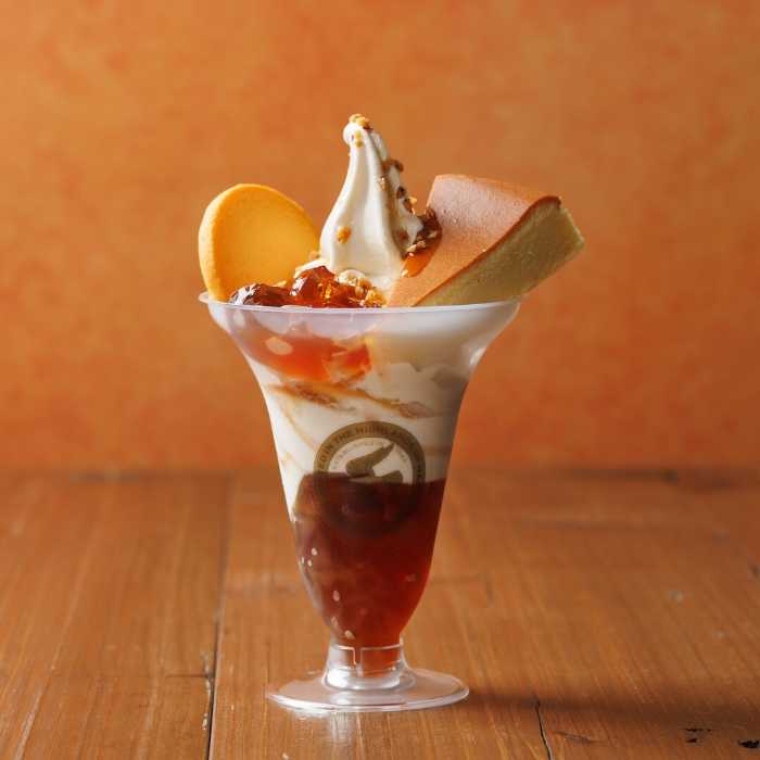 カフェ店舗限定の『季節の御用邸パフェ 和栗』は、紅茶ゼリーにチーズケーキソフト、さらに『御用邸和栗チーズケーキ』や『御用邸パンプキンチーズクッキー』を重ねた贅沢仕様。