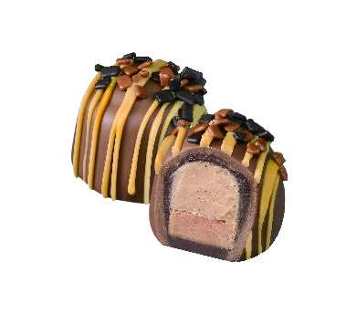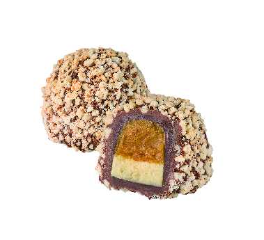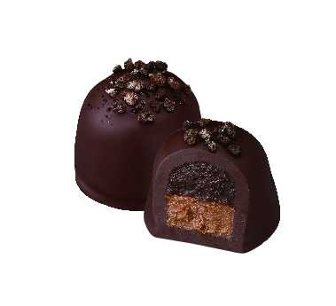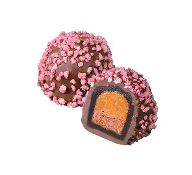 塩味を効かせたガナッシュとムースをミルクチョコで包み、ピンクのクランブルをトッピング。