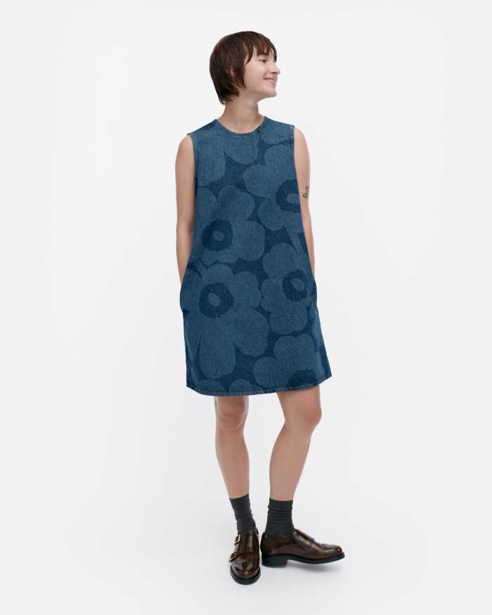 印象的なのは、洗練されたAラインシルエットの「Unikko Somasti デニムドレス」(59,400円)や、遊び心のある「Unikko Ruudut デニムスカート」(42,900円)。