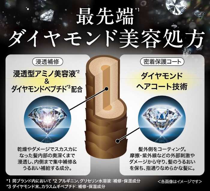 髪の内側にうるおいを届けつつ、外側は「ダイヤモンドヘアコート技術」でコーティング。集中補修とツヤを両立し、理想の美髪を叶えます。