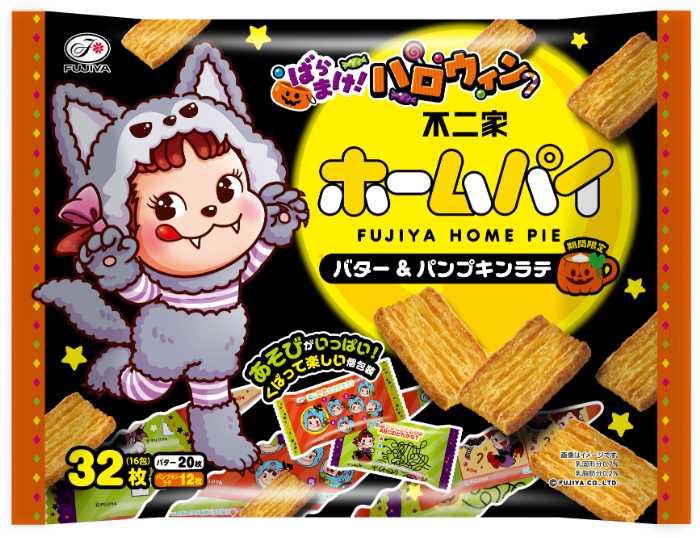 「ハロウィンホームパイ(バター&パンプキンラテ)」はバター20枚とパンプキンラテ12枚の32枚入り(10包+6包)。個包装には楽しいゲームがプリントされており、みんなでワイワイ楽しめます。