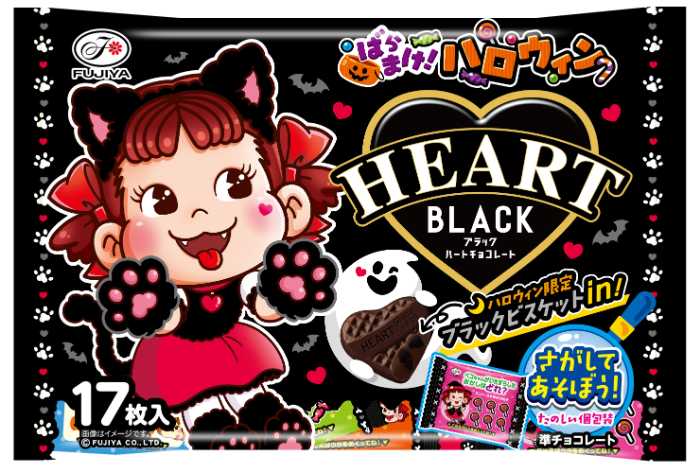 「ハロウィンブラックハートチョコレート袋」はブラックビスケットを使ったザクザク食感が魅力。17枚入り、個包装には絵探しゲーム付きでワクワク感たっぷりです。