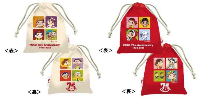 「おかし巾着(ペコちゃん75thデザイン)」は、ミルキー7粒、カントリーマアム2枚、ホームパイ4枚(2包)が入った巾着セット。税込900円で、食べ終わった後は小物入れとして使えるのも嬉しいポイントです。