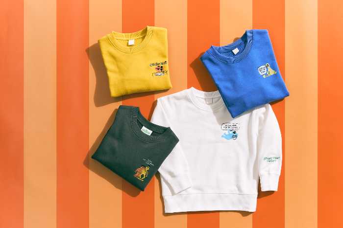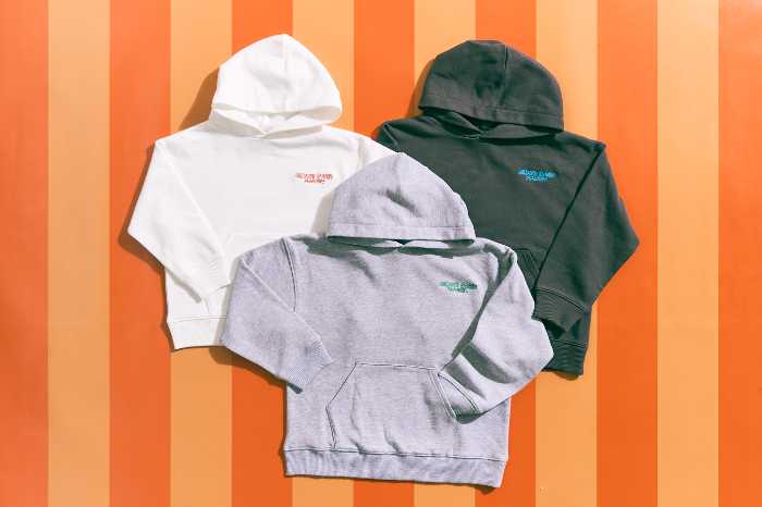 また、スウェットフーディー(全3種/6,930円/100,120)はバックに大きなアートが映えるデザイン。オフホワイト・グレー・チャコールグレーの3色展開で、遊び心たっぷりの仕上がりです。