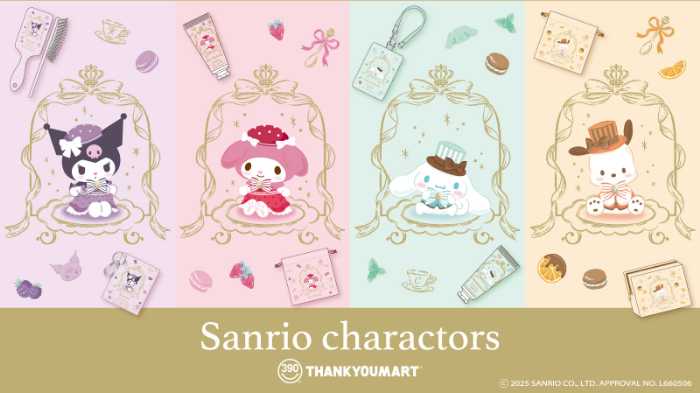 「Be Smile, Be Kawaii」をコンセプトに、かわいい推しグッズがALL390円(税込429円)で手に入るサンキューマートに、サンリオキャラクターズの限定シリーズが仲間入りします。今回のテーマは「ティールーム」。落ち着いたパステルカラーと繊細なアートで仕上げた大人かわいい雑貨が全23アイテム登場。公式オンラインショップでの先行予約もスタートします。