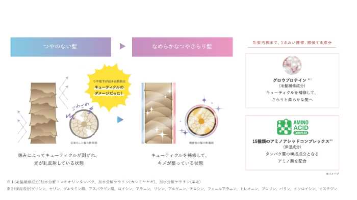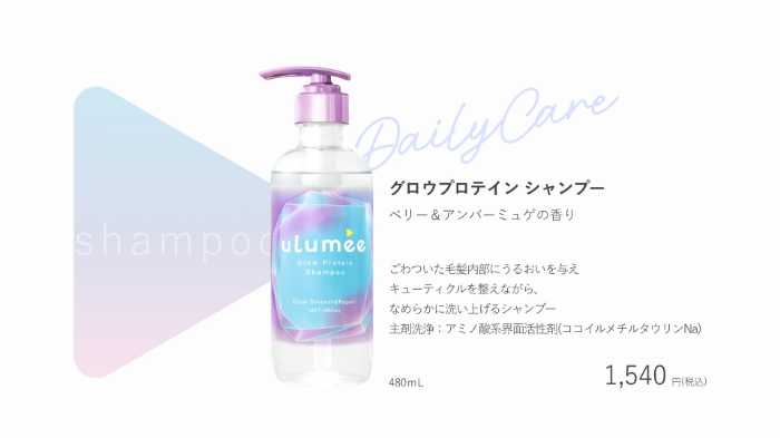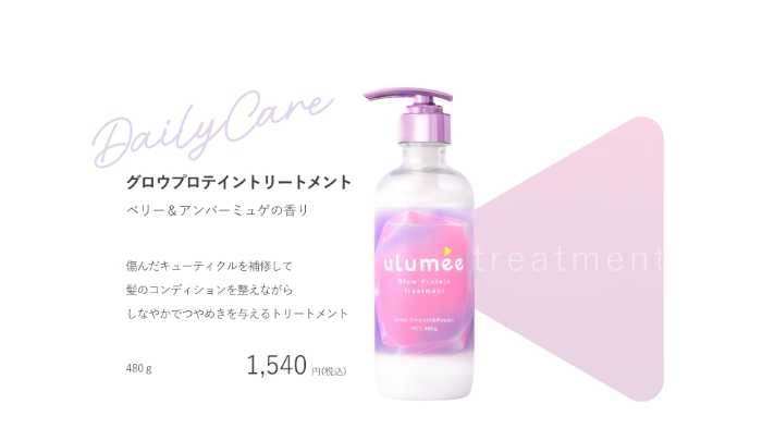 ウルミー グロウプロテインラインは、ダメージによって“スカスカ”になった髪の内部に、タンパク質を“ボンド”のように密着させる「タンパク質ボンドケア処方」を採用。