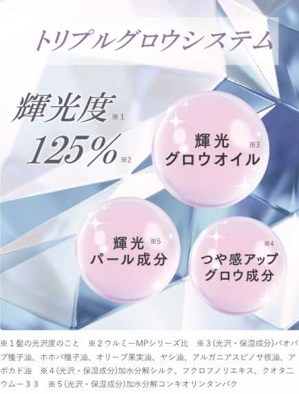 トリプルグロウシステム:キューティクル表面を整え、光を美しく反射させる仕上がりに。