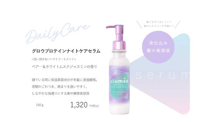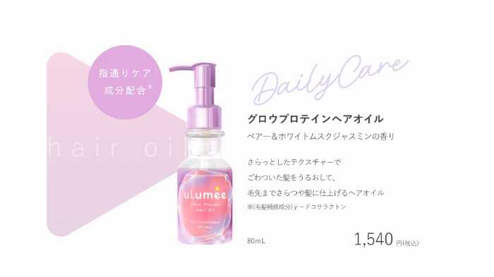 Z世代のリアルな悩みに応える ulumee(ウルミー) グロウプロテインラインは、髪の内部と表面を同時にケアし、つややかで指通りのいい髪へと導きます。
