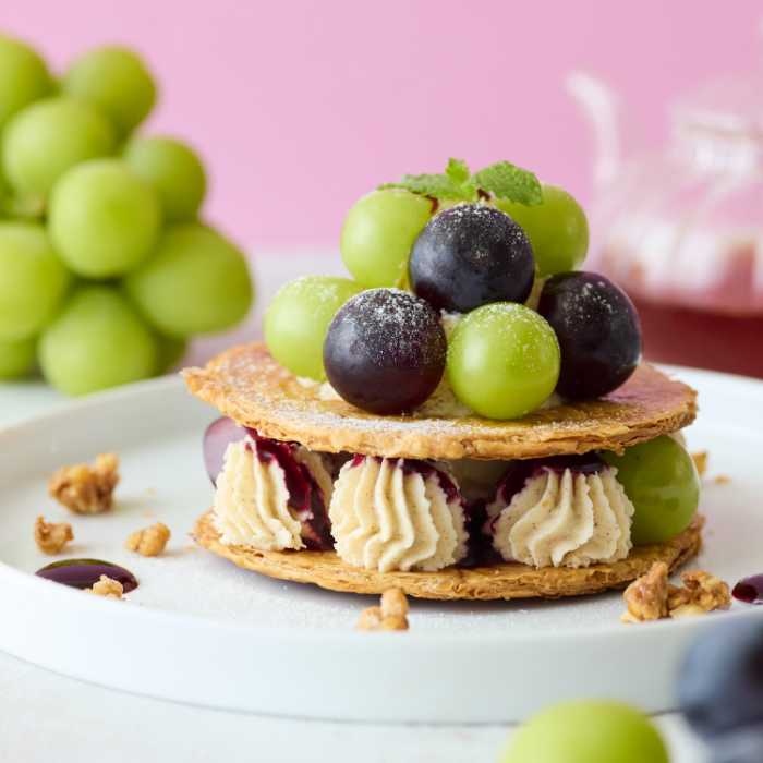 瑞々しいシャインマスカットや巨峰に、チーズホイップやゼリーが重なり合い、華やかな味わいに。