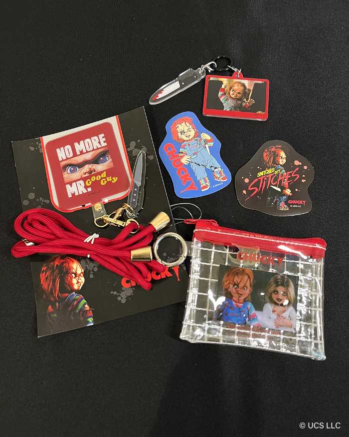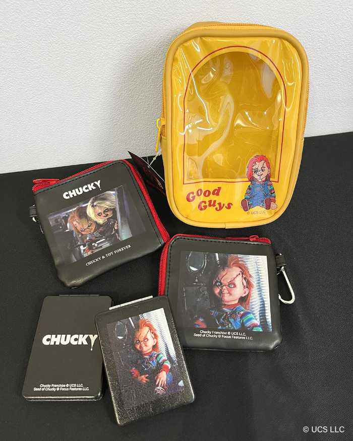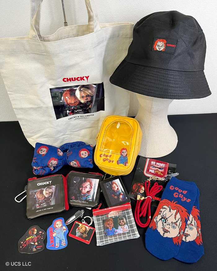 今回のコラボでは、リアルなチャッキーの実写デザインとポップなカラーを掛け合わせたインパクト抜群の全17アイテムが登場。