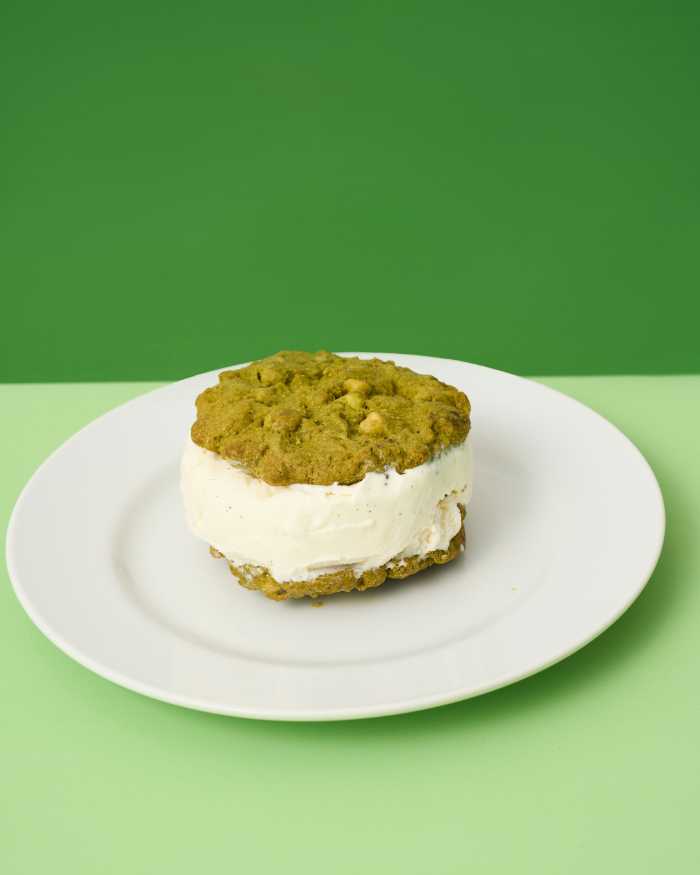 「抹茶ホワイトチョコクッキーのアイスサンド(税込680円)」は、抹茶クッキーとバニラアイスの絶妙なバランスが魅力です。