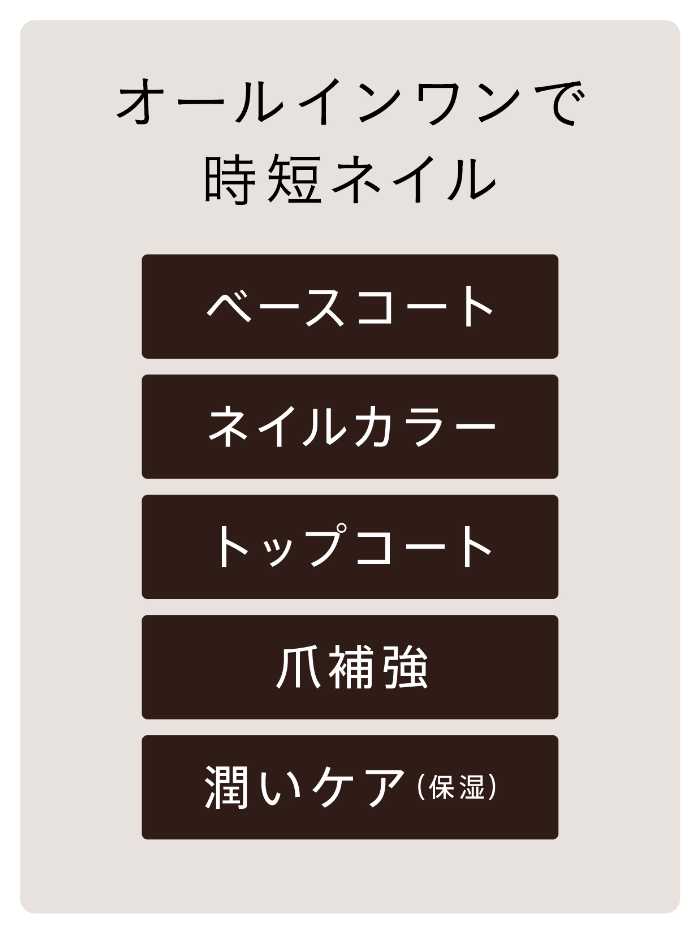 「グロッシーコート」は、ベースコート、カラー、トップコート、爪補強、潤いケアの5つの機能を備えたオールインワンネイル。