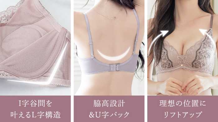 さらにカシュクールデザインとL字構造で、下からだけでなく横からもしっかりサポート。ワイヤーのくい込みやカップの浮きが気になる人にも嬉しい、快適な着け心地を実現しています。