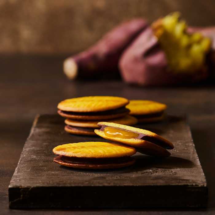 さつま芋のパウダーとペーストを丁寧に混ぜ合わせ、バターと生クリームで炊き上げたキャラメルをミルクチョコレートで包み、さらに香ばしいバタークッキーでサンドした「N.Y.スイートポテトキャラメルサンド」。