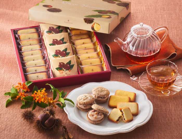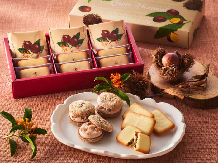 栗とメープルの香り豊かな焼き菓子は、秋のティータイムや贈り物に最適。ラングドシャとの詰め合わせも選べ、シーンに合わせて楽しめます♪