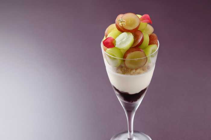 「山梨県産ぶどうのパルフェ〈サンシャインレッド&シャインマスカット〉」(喫茶/ドリンク付き3,300円税込)は、層ごとに異なる食感が楽しめる贅沢なひと品。