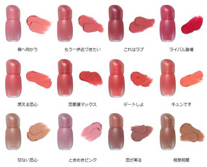 口角や輪郭まで繊細に描けるので、プロ級の仕上がりを叶えます。カラーバリエーションは「君へ向かう」「燃える恋心」「デートしよ」など恋心をテーマにした全12色。