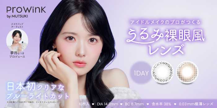 「可愛いカラコン」ではなく「可愛い瞳」をつくることをコンセプトに誕生したカラーコンタクトブランド『ProWink(プロウィンク)』。メイクアップアーティスト夢月さんがプロデュースし、高嶺のなでしこの松本ももなさんがイメージモデルを務めます。日本初*の無色ブルーライトカットレンズを採用し、まるで裸眼のような自然さと快適さを実現。8月31日(日)よりQoo10メガ割にて先行発売される注目の新作です。