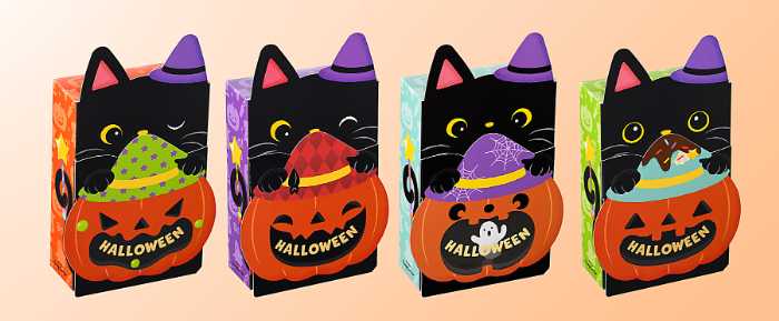 黒ねこの仕掛けボックスや持ち手付きのジャック・オ・ランタンバッグは、見た目も華やかで気分を盛り上げてくれます。ホームパーティーの演出や「トリック・オア・トリート!」のお菓子交換にも大活躍。