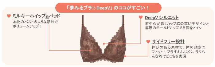 「夢みるブラⓇ DeepV」ならではの底厚モールドカップで、バストをしっかり中央に寄せて美しい谷間を演出。