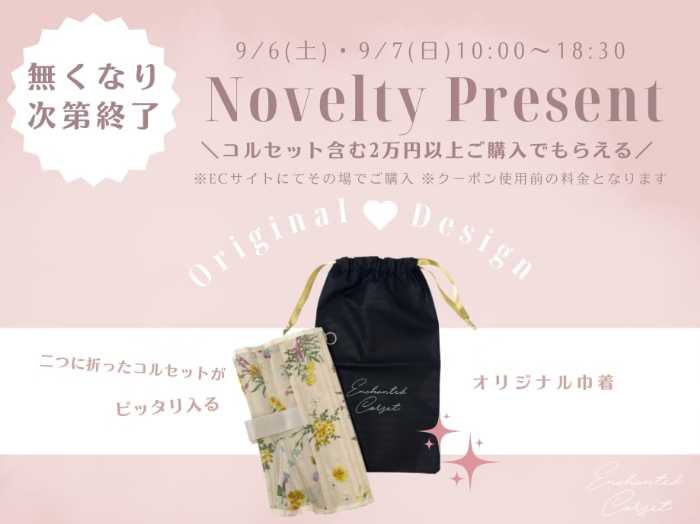 会場では、税込2万円以上の購入で「オリジナル巾着」を各日先着でプレゼント。コルセット収納に便利なサイズ感で、数量限定となっています。試着可能なアイテムは以下の通りです。