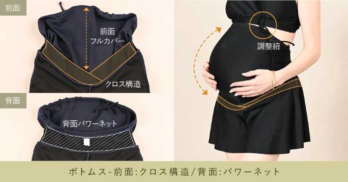 ボトムスはパワーネット・クロス構造で、お腹の大きさが変化するマタニティ期にも自然にフィット。調整紐付きで臨月でも使いやすく、動きやすさと安心感を両立しています。
