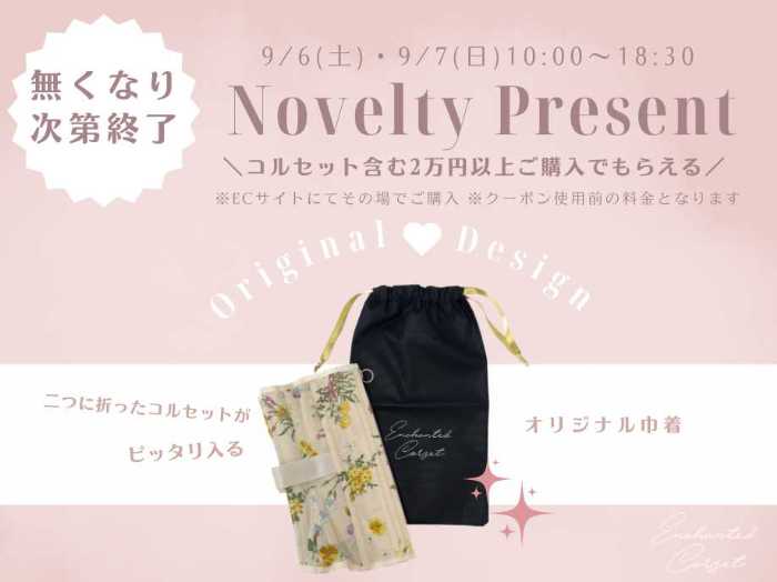 さらに、税込2万円以上(コルセットを含む)をその場でご注文いただいた方には、各日先着でオリジナルデザインの巾着をプレゼント。