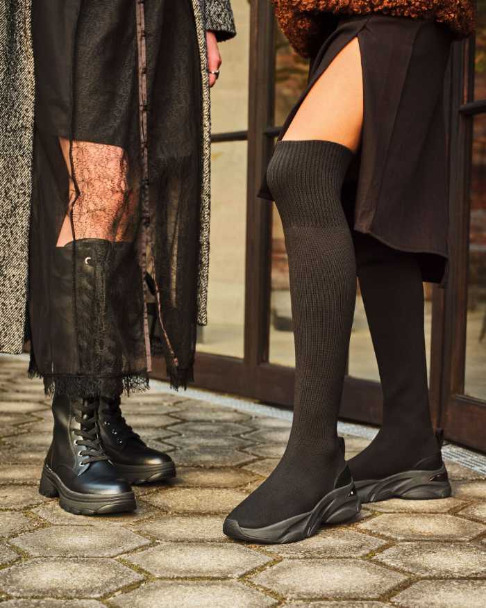 トレンドのニット素材やロング丈で、スタイルアップ効果も◎。クロやアイボリーの落ち着いたカラーで、秋冬コーデにしっとり馴染みつつ、足元から華やぎをプラスします。