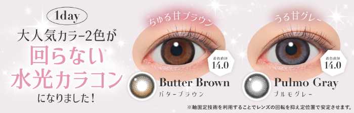 人気の水光デザイン「Butter Brown(バターブラウン)」「Pulmo Gray(プルモグレー)」の1dayは、軸固定仕様にリニューアル。レンズが回らず、常に“可愛い位置”をキープできるのが嬉しいポイントです。