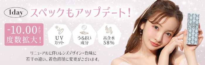 さらに1dayはUVカット機能やうるおい成分を追加し、高含水58%のレンズへスペックアップ。長時間つけても快適な着け心地を実現しました。