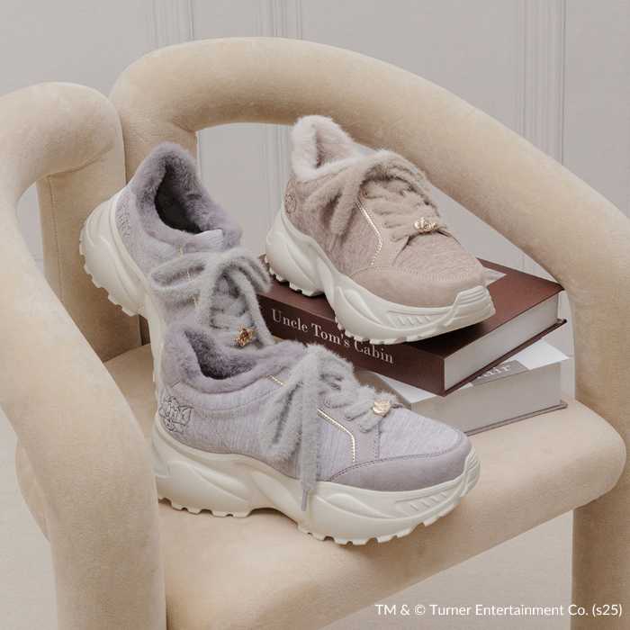 ふんわりファーと上品なベロアリボンが華やかで、ソール裏にはトムとジェリー&タフィーのアート入り。
