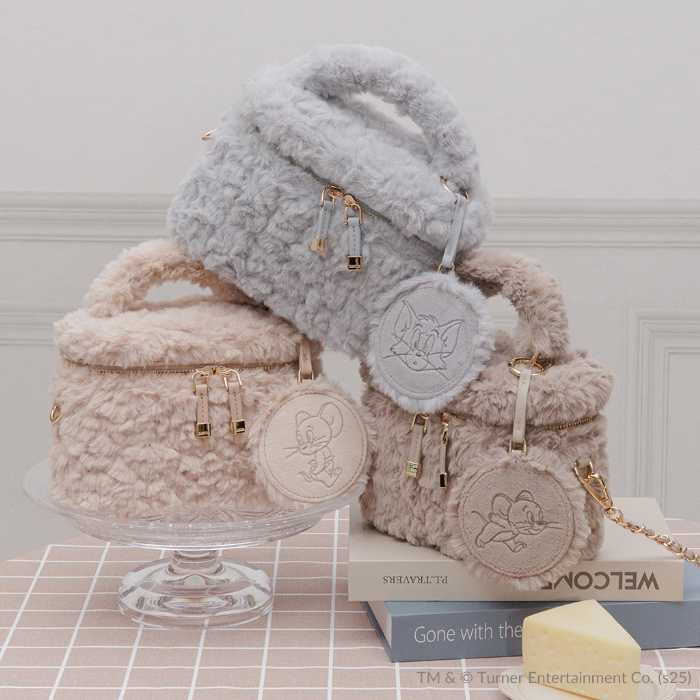 ミラー付きバニティバッグ(FB36149)は¥17,930(税込)、トムはグレー、ジェリーはベージュ、タフィーはピンクのファーで表現。付属ミラーには刺繍入りで、コンパクトながら収納力も抜群。