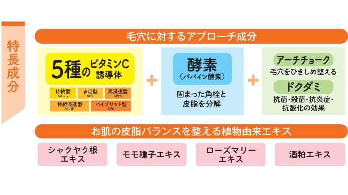 5種のビタミンC誘導体が毛穴をキュッと引き締め、なめらかな仕上がりへ導きます。