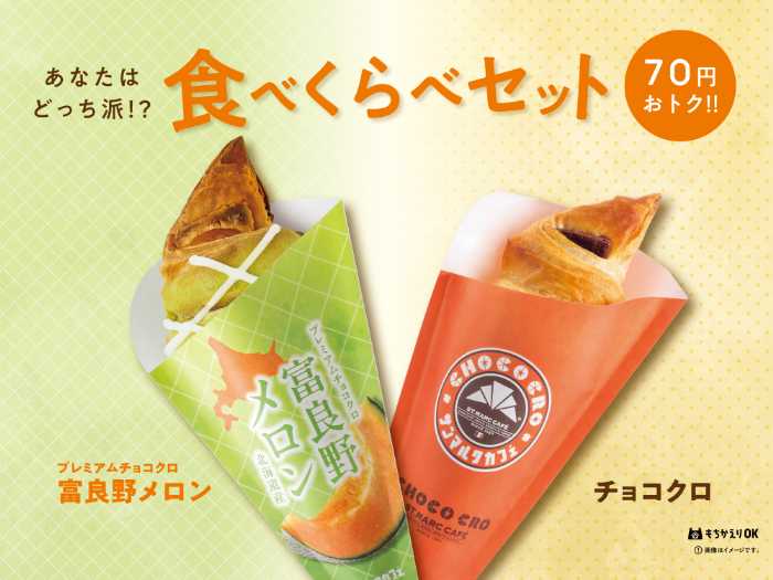 今回登場する「プレミアムチョコクロ 富良野メロン&チョコクロ 食べくらべセット」は、「プレミアムチョコクロ 富良野メロン」1個と「チョコクロ」1個がセットになり、価格は550円(税込)。