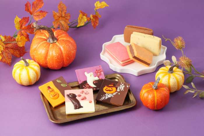 ハロウィン限定のフィルムに包まれた「ショコラサンド」(各238円/税込)と、かぼちゃやおばけなどをデザインした「タブレットショコラ」(各270円/税込)が登場。